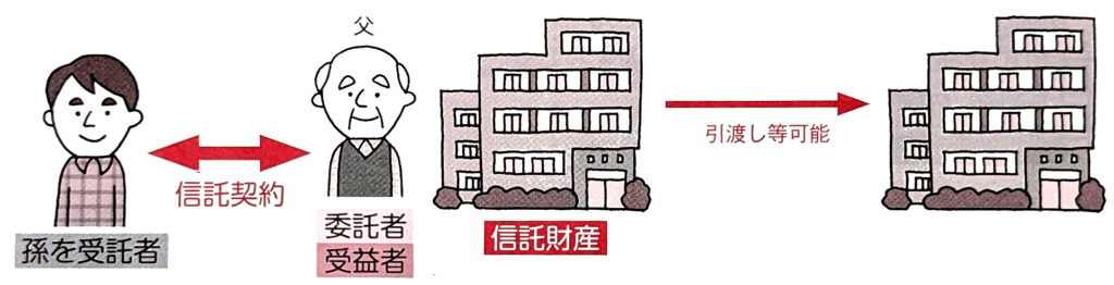 最終的に2年ほど経ってマンションが完成するまでに、仮に父親が意思判断能力を喪失したとしても、新築のマンションは信託財産として受託者の名義で登記をし、受託者が金融機関との手続を遂行します。しかし、受益者は父親なので、その不動産からの家賃収入、借入金の返済などはすべて受益者である父親が負担することになります。つまり、孫である受託者が契約の遂行、及びその後の物件の管理を自らの権限で行えるということなのです。